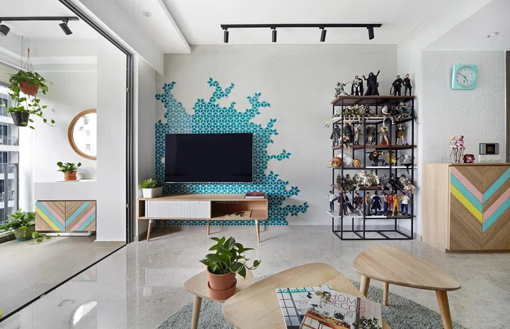 In the living area, diamond-shape mosaic tiles from An Huat were used as a backdrop for the TV console, zoning the open-concept space. Bridging the living and dining areas, a shelf full of Raymond's toy figurines and collectibles add to the fun.