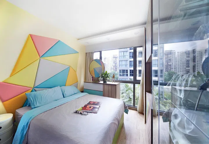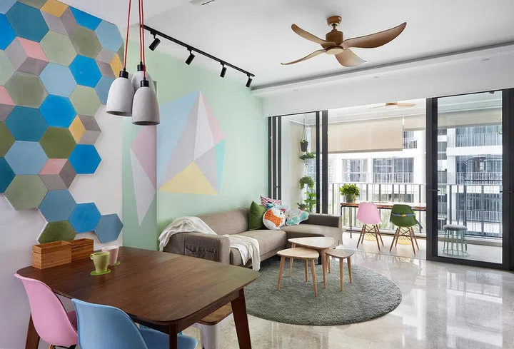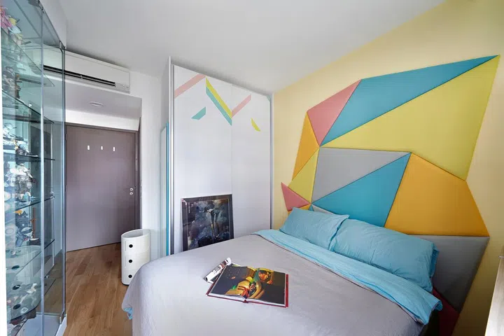 You might have heard of the interior design firm Free Space Intent, and now, here's a look at its design director Raymond Seow's home! It's a three-bedroom condominium unit in the Serangoon area, sporting a fun and colourful geometric theme. Raymond lives here with his wife and young son.