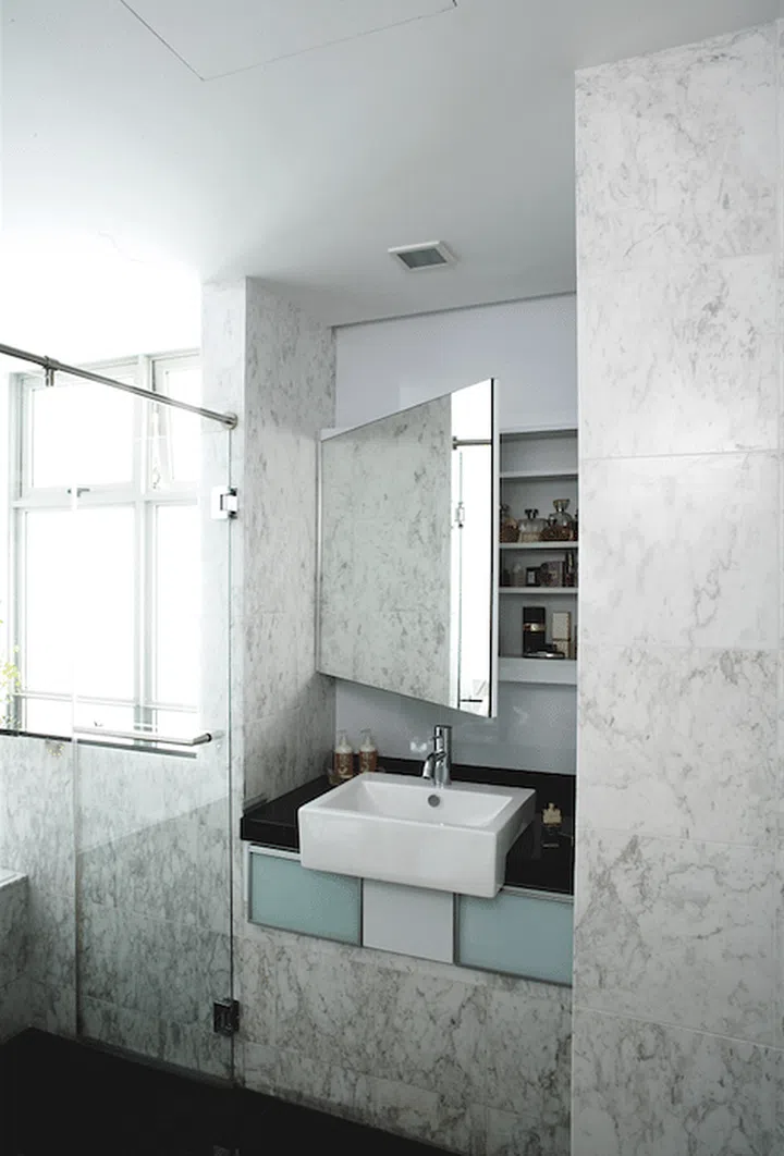 The original window was covered up and replaced with a mirrored cabinet to provide storage for Mrs Peh's beauty products.