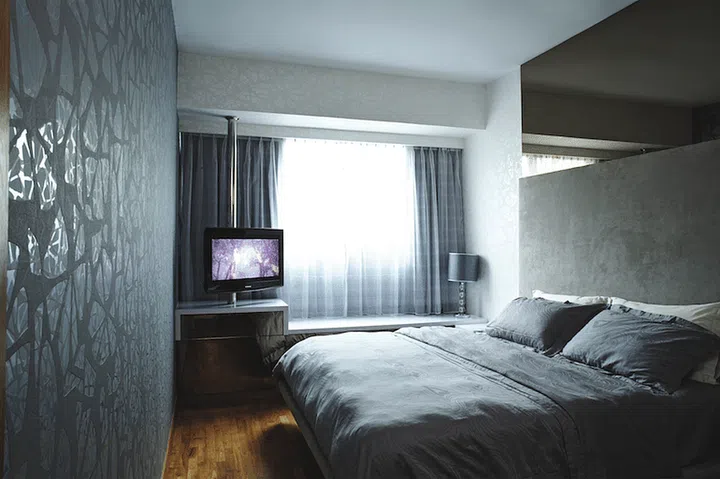 The metallic grey wallpaper creates a restful ambience while the stainless steel pole becomes a mount for the television set and doubles up as clever concealment for messy wires.