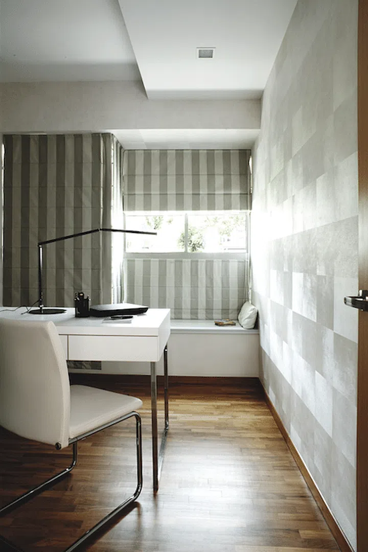 Full length windows bring in nice natural lighting but they can inhabit privacy. Arean designed double-panelled (top and bottom) blinds with stripes in subtle hues to guard the family's privacy.