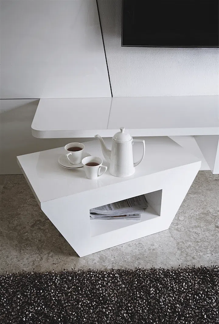 For the living and dining areas, a modern yet luxe touch was created with a matte gold crushed metallic vinyl wall covering. With furnishings like the suspended television console, created with a combination of pearl-tinted raw cement screed and glossy laminate, complement the gold hue.