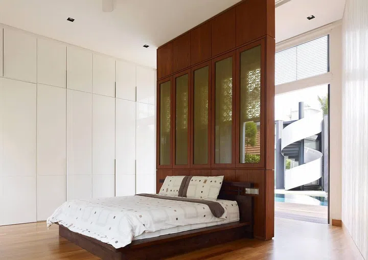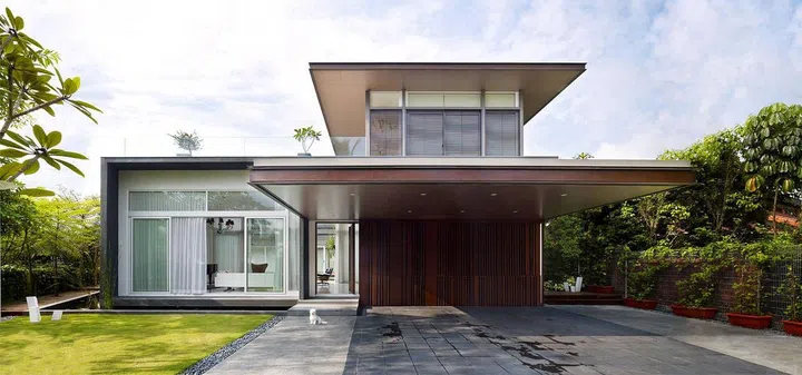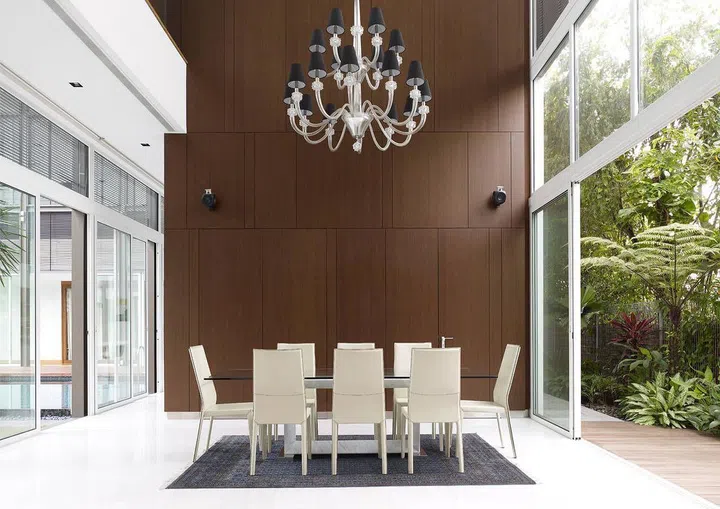 For this home situated along Bukit Timah road, the owners desired simple and clean aesthetics with a neutral colour scheme. The design team from Topos Design Studio proposed a tropical Minimalist style for the architecture, accented by straight lines and wide, open spaces. The large cantilevered roof over the porch sets the tone perfectly, leading to a large wood-panelled wall next to the main door.
