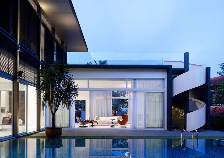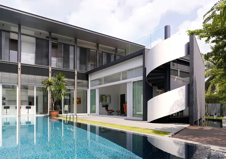 A row of window screens further the look of lines running throughout the home, intercepted by the addition of a large spiral staircase. Being the only curved structure in the home, the spiral becomes the centre of attraction when one is passing by the pool area.