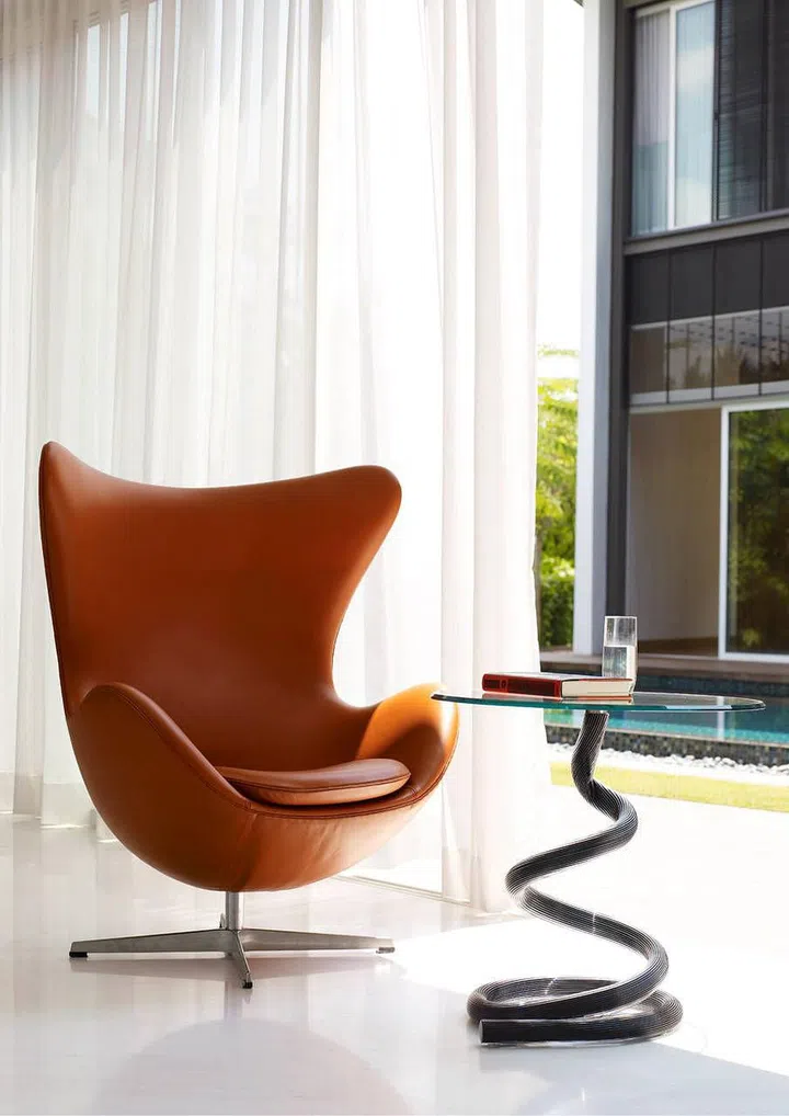 In a corner, a Fritz Hansen Egg chair offers an inviting space for one to retreat to during the day.