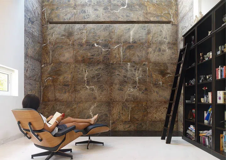 Textures dominate within the spaces, and one can see a wide variety of that, ranging from rough-cut stone surfaces to sleek marble and dark-stained wood.