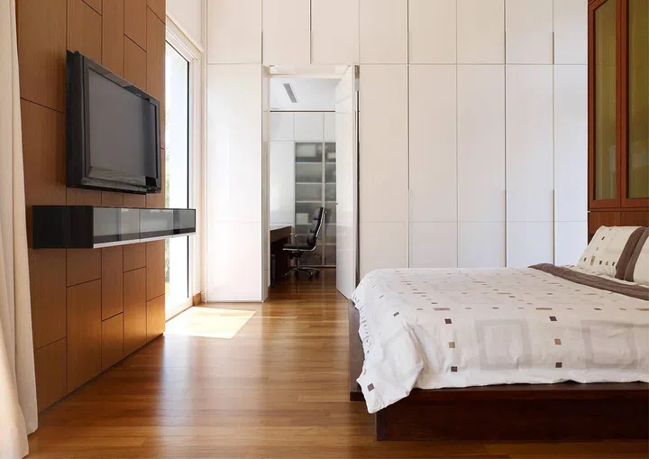 The seamless look of the wall panels allow for the concealment of doorways and storage spaces.