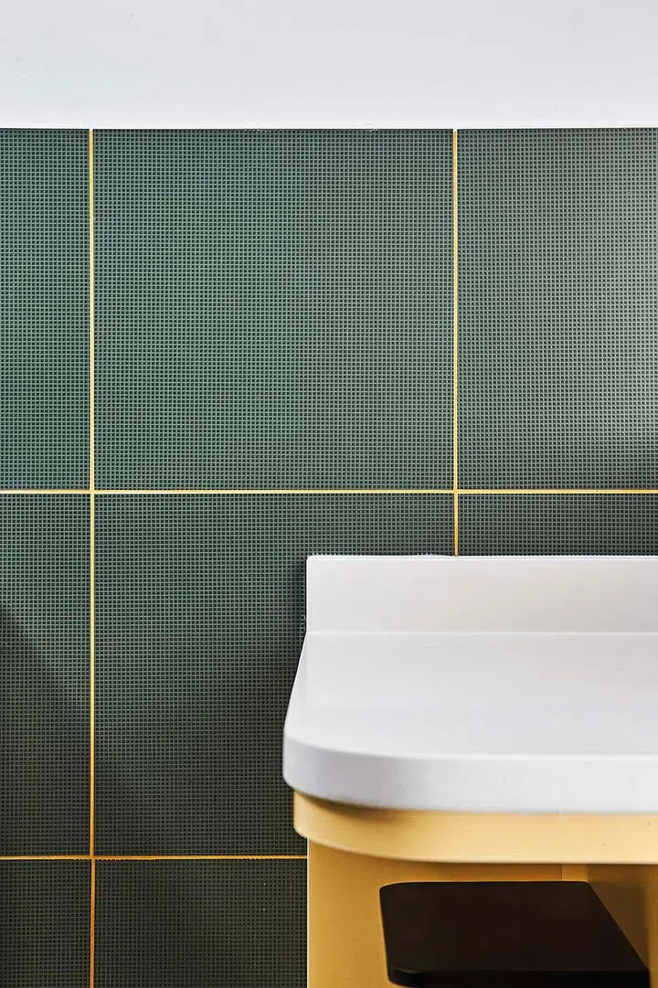 The mustard grout against the green tiles in the common bathroom always surprises new visitors.