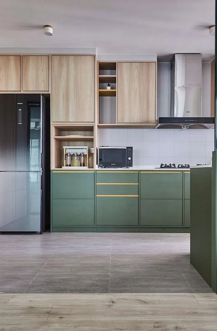 The green powder-coated sliding and fixed glass panels separating the semi-open kitchen from the dining area sync with the overall colour scheme.