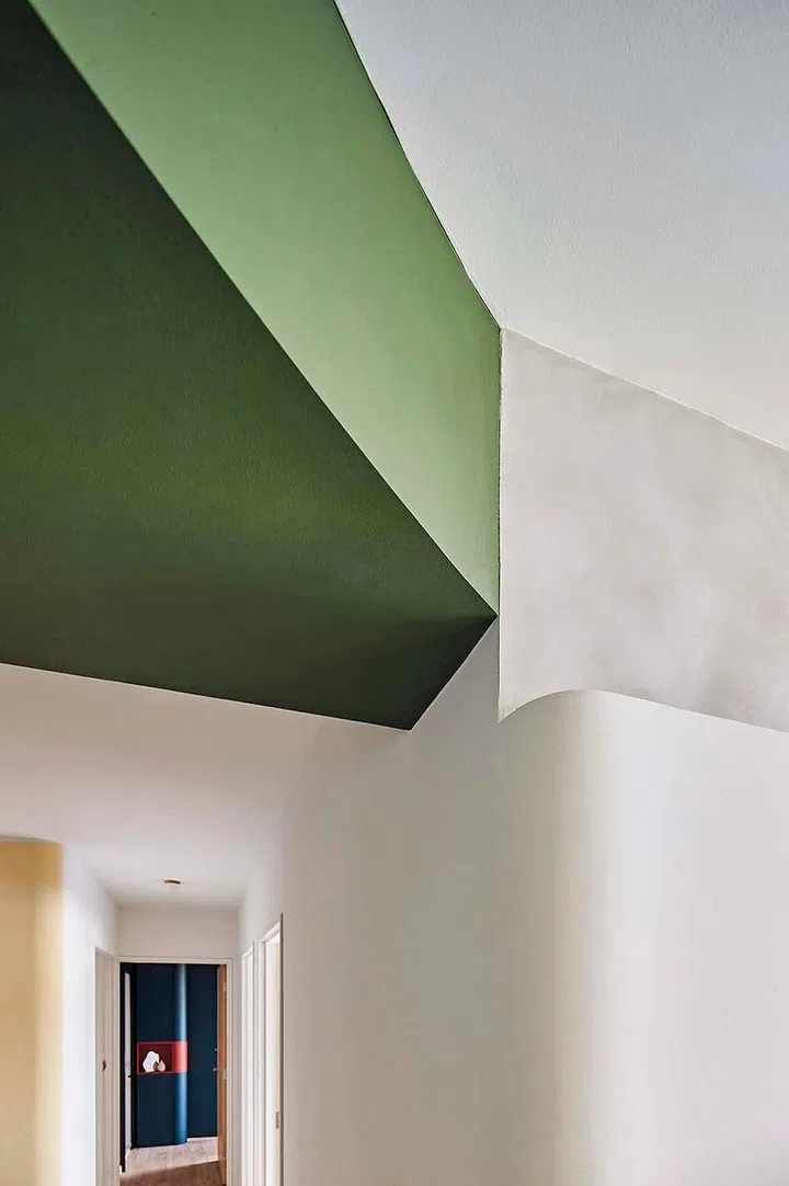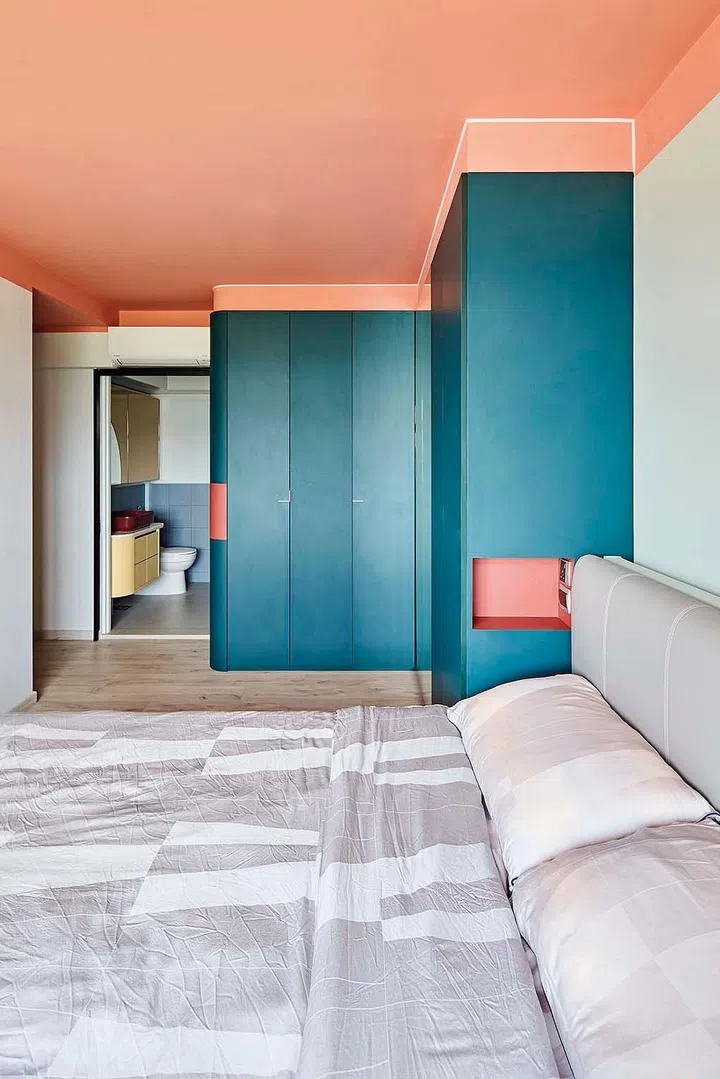 The bedroom introduces a bolder combination: blue-green and coral on the built-in wardrobe and ceiling.