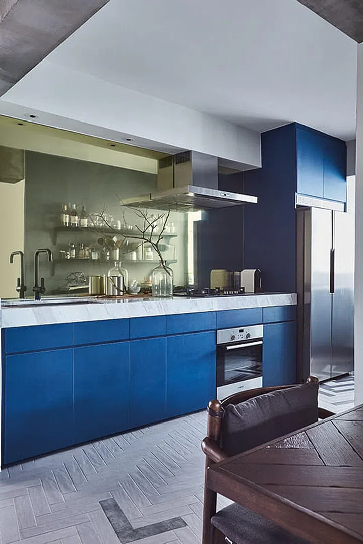 The kitchen, with a counter finished in a vibrant blue laminate and topped with marble, is backdropped by champagne tinted mirror panels that visually expand the compact BTO kitchen space while adding an unexpected element of glamour.