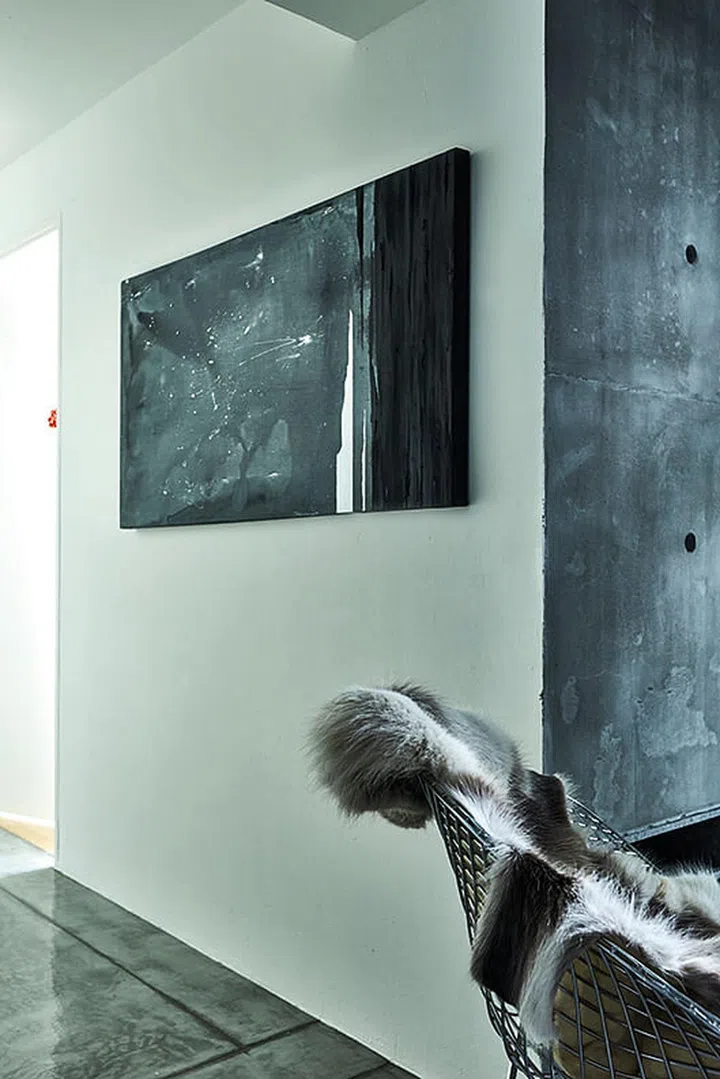 The home is decorated with paintings by Simone, such as this artwork in the corridor leading to the bedrooms, transforming transitional spaces into gallery-like experiences.