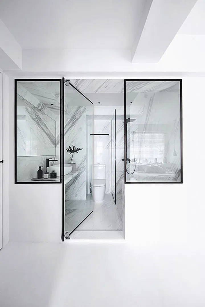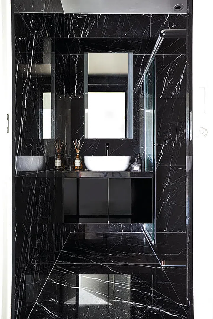 Both the bathrooms are fully clad in polished marble—the common one in dramatic black Nero Marquina and the master en suite in luminous white Volakas, offering unexpected glamour even in the compact spaces typical of Singapore BTO bathrooms.