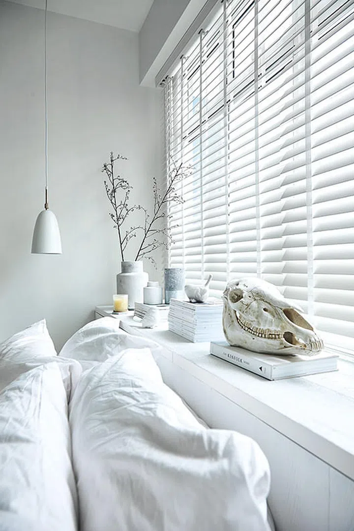 To create the serene atmosphere in the master bedroom, the designer used engineered wood that was painted white for the built-in platform, and the bed was positioned against the windows for soft backlighting that creates a naturally ethereal atmosphere as daylight filters through sheer curtains. This thoughtful positioning transforms the quality of light in the room throughout the day, from the gentle morning glow that gradually awakens the couple to the warm evening light that signals transition toward rest.