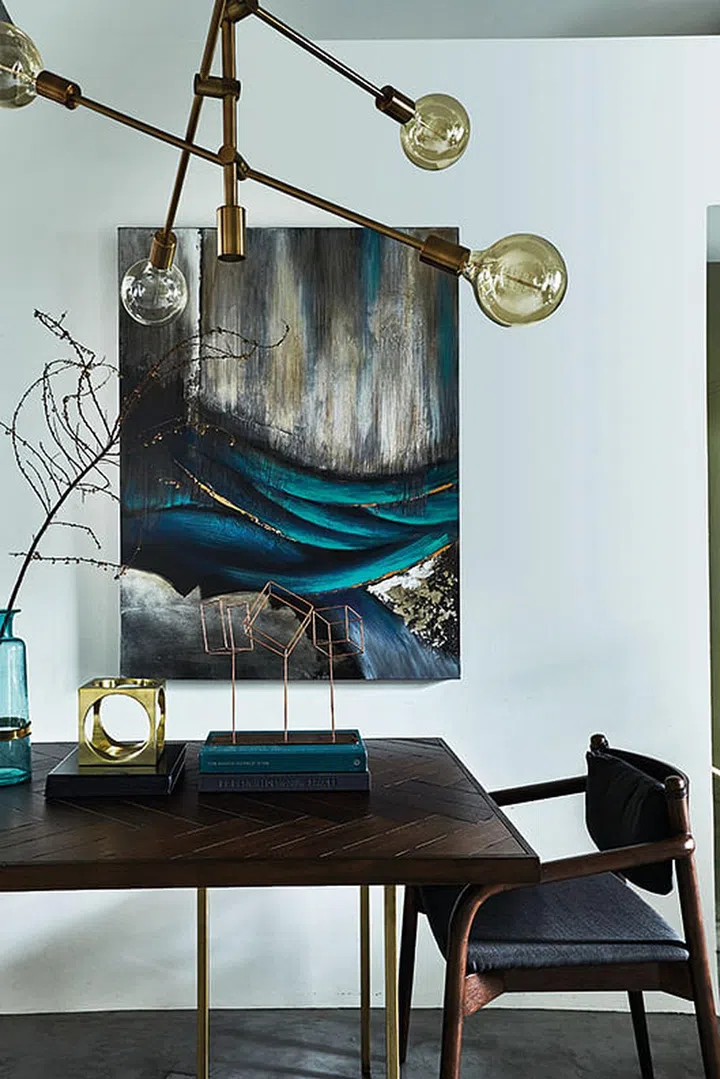 Artwork from Taylor B provides a focal point that draws the eye, while carefully selected metallic decor accessories from CB2 create moments of reflection and visual interest throughout the space. Together, these elements define the dining experience as separate from, but connected to, the adjacent living zones.