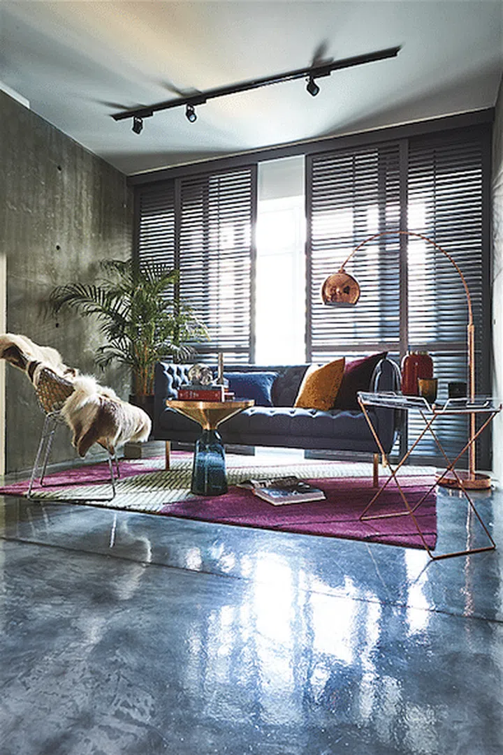 Concrete screed flooring and cement walls form the bare canvas of the open-concept living area, which is played up with stylish furniture and decor in attractive jewel-tone shades and metallic accents. Morning light streams through carefully considered window treatments, creating dramatic shadows across the textured surfaces and bringing the industrial elements to life.