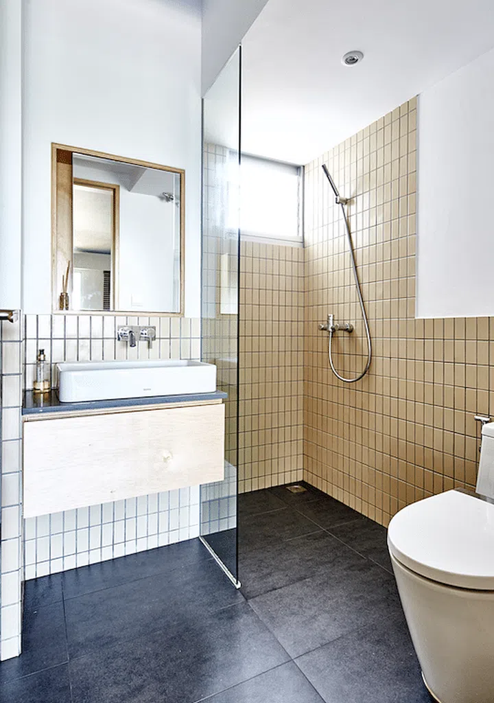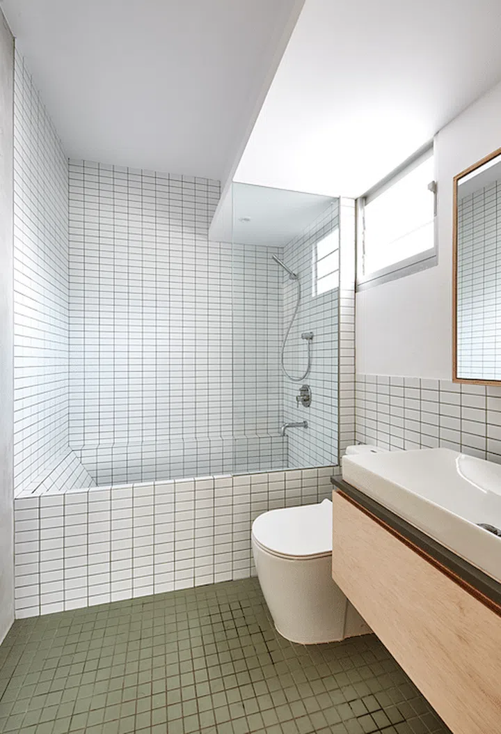 They could not find a bathtub to fit the bathroom, so the designers cast one with a chamfered edge, and lined it with tiles that match those of the bathroom.