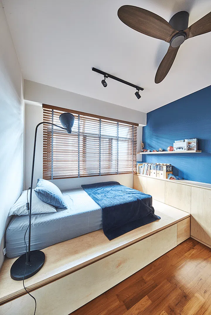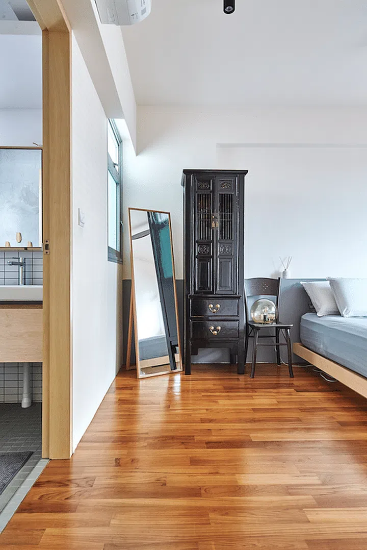 Just as the couple wear many hats, their three-bedroom HDB apartment must also serve a multitude of purposes. The couple tasked multidisciplinary design practice Waff to handle the project, specifying the need for functional space throughout the entire home as a priority. This was achieved with built-ins and clever space planning, which totalled $80,000 in renovation costs.