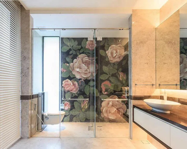 In keeping with the modern classical approach, this bathroom features a beautifully designed mosaic wall. The darker colours stand out against the light neutral scheme.