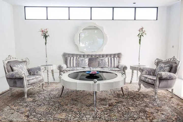 In this drawing room, finely detailed upholstery and a large carpet brings the various elements together, according the space with a cosy atmosphere.
