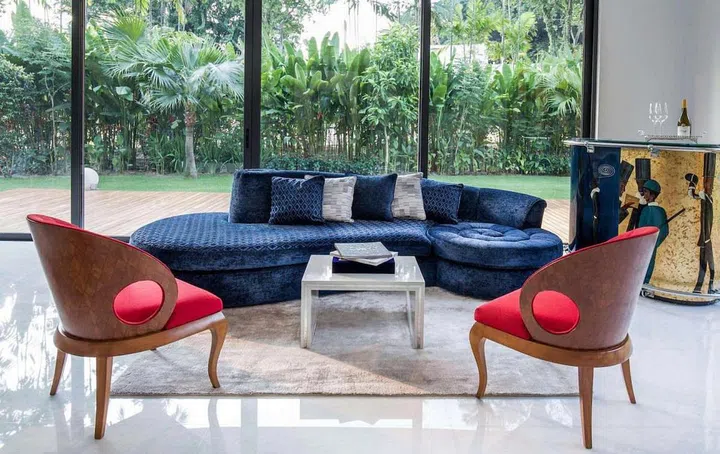 The sitting corner close to the side garden offers punches of colour, accented by a European bar counter.