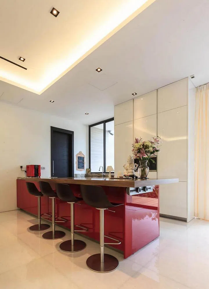 At one side of the living space, a red open kitchen counter injects life and vitality to the home.