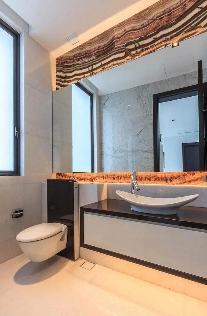 In the powder room, the breathtaking grains of the onyx marble become the highlight of the space.