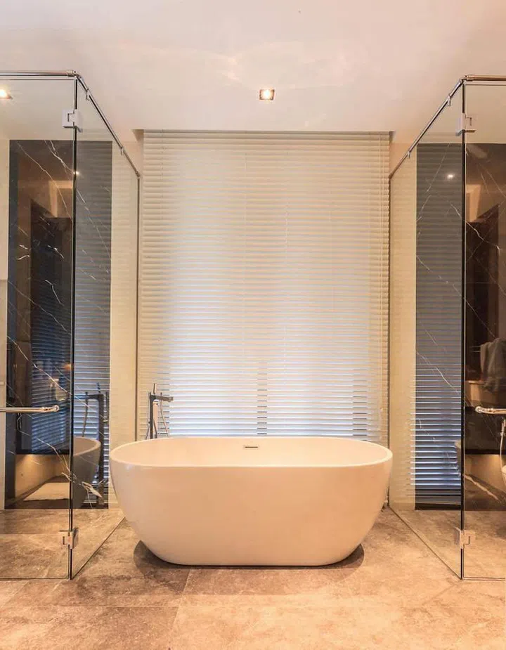 In the master bath, a freestanding tub sits in the middle of the room, flanked by an enclosed shower on one side and the WC on the water.