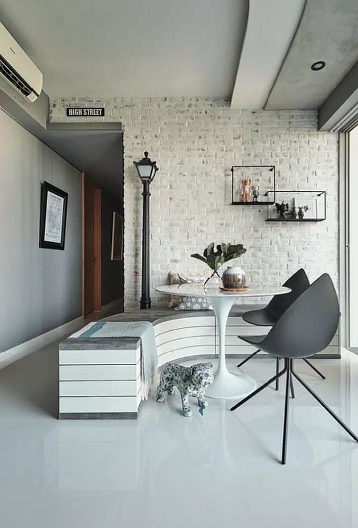 For the open dining area, the designer customised a curved bench that brings to mind urban street seating, and sourced the street lamp from a shop in Balestier.