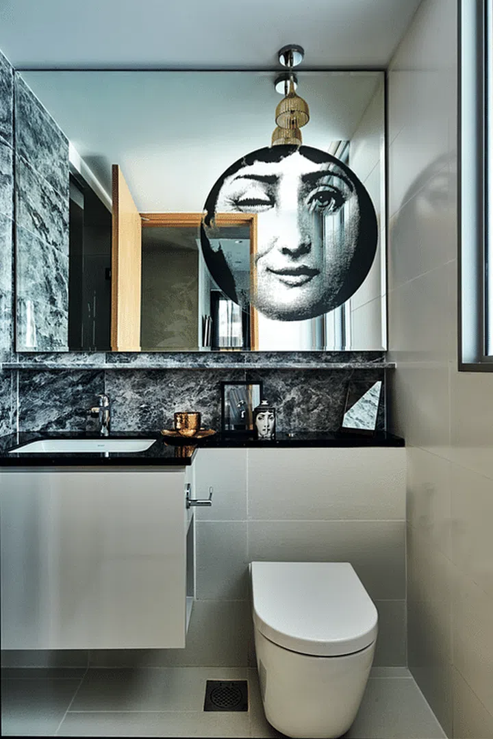 The bathroom has a monochromatic theme and features an eye-catching Fornasetti-inspired customised decal on the mirror, for a playful touch.