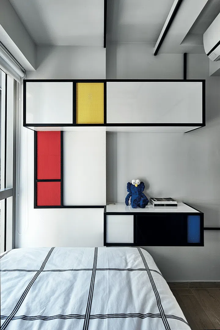 Inspired by Dutch artist Piet Mondrian’s famous De Stijl paintings, the second bedroom has a design that is rooted in bold geometry and primary colours.
