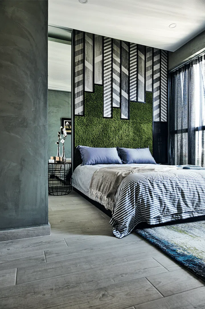 Dulux Ambiance paint was used in the master bedroom to create the textured grey wall, while a green rug and wood-look tiles with stripes form the prominent feature wall behind the bed.
