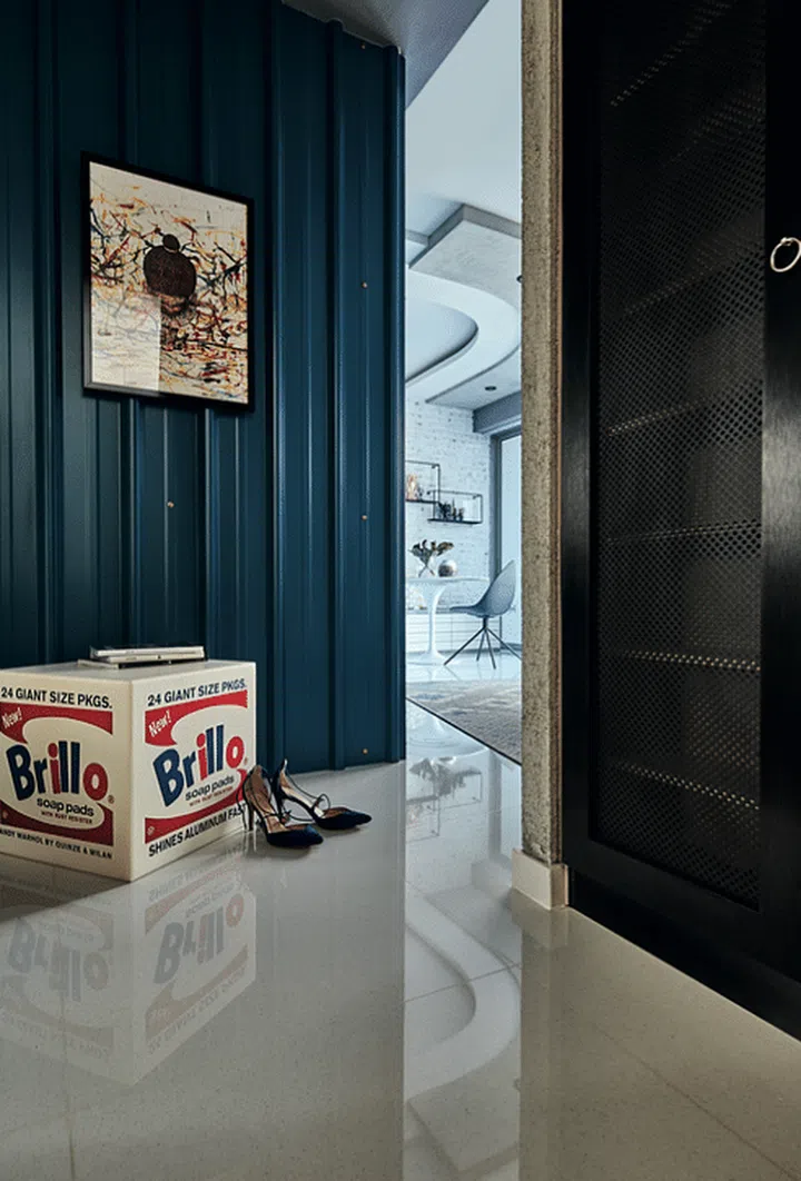 The “cargo container” — the first thing you see upon entering the home — was created by bolting blue metal hoarding panels to two adjacent walls.