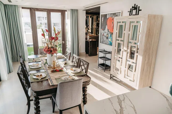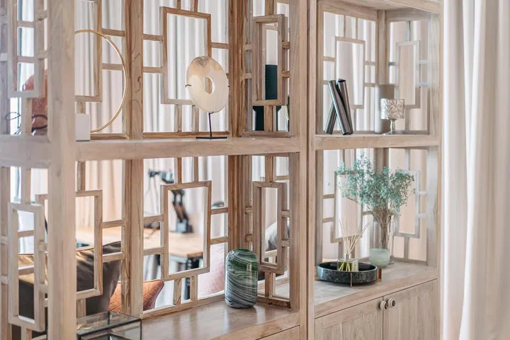 In the dining room, natural tones and textures were chosen for the dining table and crockery shelf to tie in with the wooden panes of the balcony doors and windows. Mirrors, marble and porcelain finish tie in the luxe look.