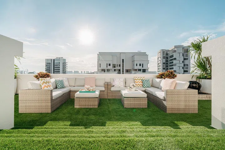The outdoor spaces of this home are grounded in greenery, including artificial turf, potted plants, or even urban vegetable beds. Different entertaining areas such as private dining nooks, intimate armchair seating, and large lounging spaces fit the family's various needs.