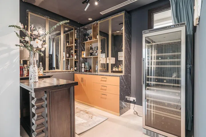 The cabinets are finished with marble, with gold accents around the glass panels and on the cabinetry handles.