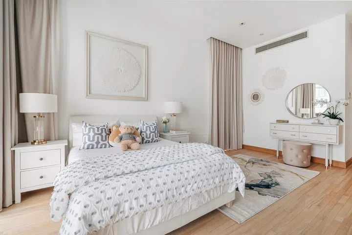 The bedrooms of the couple's eldest and teenage daughter are designed with a similar white and neutral base. The teenage daughter requested an all-white room. The colour palette is mainly white, beige and a pop of blue. A white vanity adds a touch of personality to the room. A circular art decor piece is used to pair with the round mirror of the vanity.