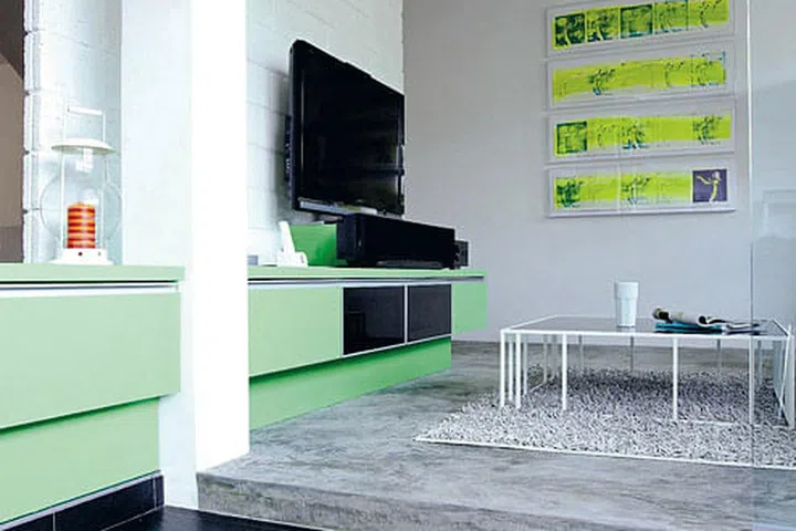 The bright green console adds a vibrant counterpoint to the space, its bold color carefully selected to inject life and energy into the industrial backdrop.