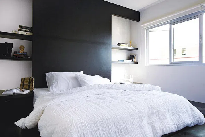In the master bedroom, a carefully crafted timber platform becomes more than just a base for the mattress. Recessed lights along its edge create a dramatic nighttime transformation, softly defining the sleeping area and adding depth to the room’s industrial-organic narrative.