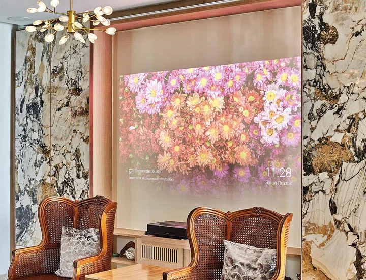 The son’s bedroom door originally opened to the living room; its shift to the corridor created a space for a feature wall that opens up to reveal a blank wall reserved for the short-throw projector that the family has instead of a TV set.