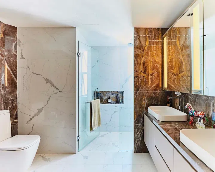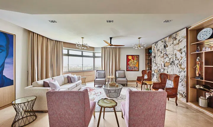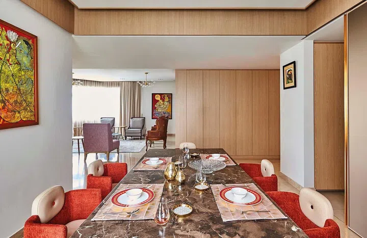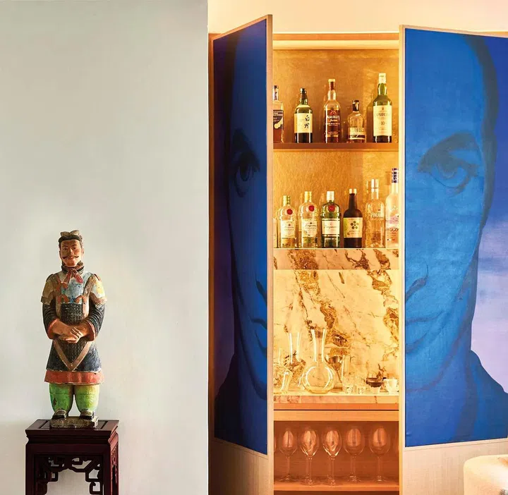 Offcuts from the large-format marble-look Florim tiles for the sliding feature wall were used for the interior of the bar concealed behind a double door embedded with a striking diptych artwork Kirti won at an auction in Mumbai.
