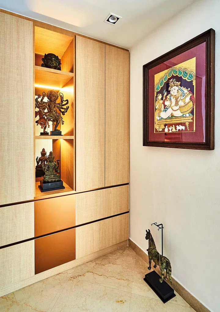 The storage at the foyer features a handsome display. The tanjore painting was a gift from Kirti’s parents.