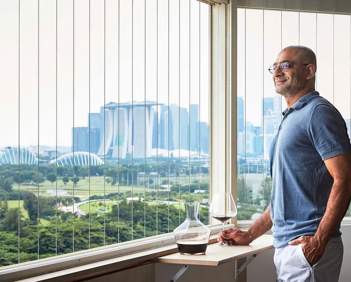 The rose gold glass door slides open to reveal Kirti’s wine fridge, which fits 150 bottles, a fraction of his extensive collection housed elsewhere.