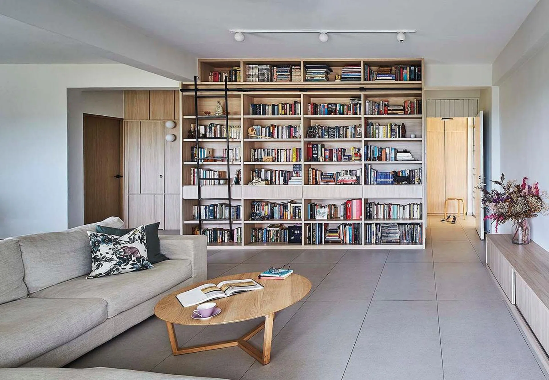 The large-format rectangular floor tile adds to the formality of space while a full height, 2.9m tall bookshelf fitted with a sliding steel staircase breaks the symmetry of the space, taking centre stage and serving as a functional alternative to a feature wall.