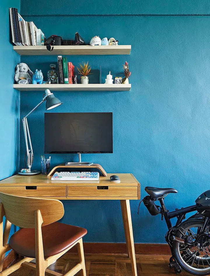 The study corner in the younger daughter's room pairs teal walls and warm timber furniture. The carpentry includes a pull-out ledge that the eldest daughter uses as standing work desk.