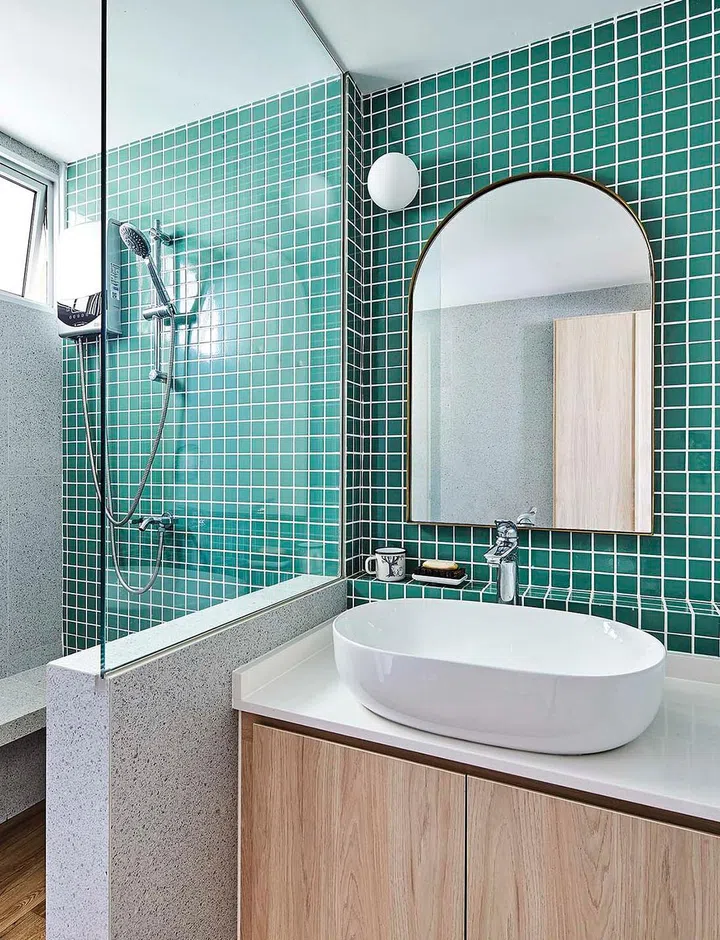 Meanwhile, the common bathroom features a more cheerful deeper green tile with white grouting that lends a graphic touch.