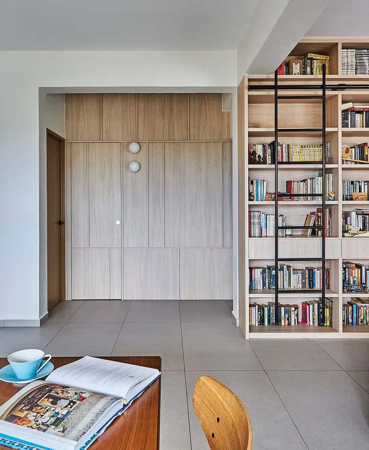 Pale wood laminate clad the wall concealing the bathroom door, visually tying the space with the bookshelves.