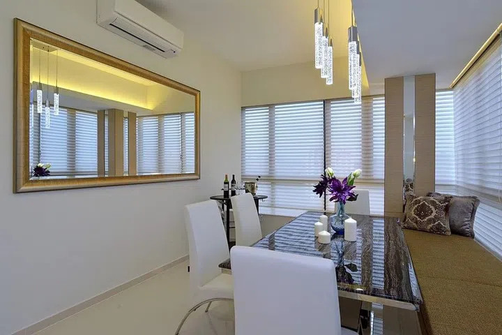 Mirrored panels were used on the columns as well as on the feature wall to make the living room look spacious and inviting.