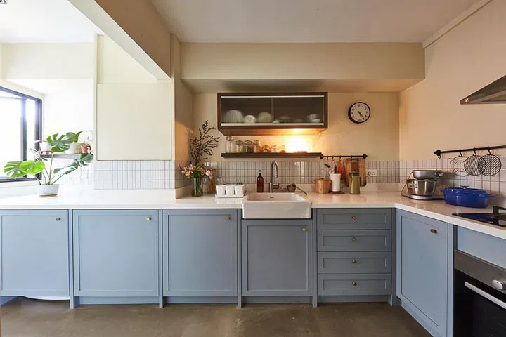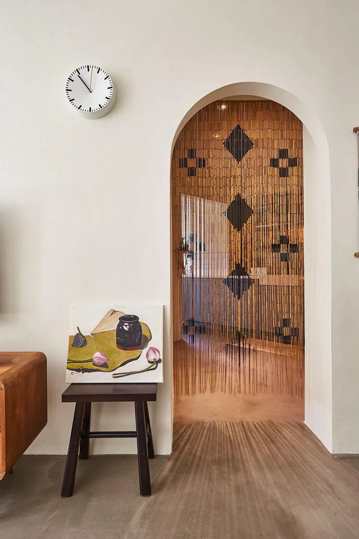 The bookshelves, along with the rattan wardrobes in the bedrooms and dusty blue kitchen cabinets are just a handful of built-in furniture one will find around the house, as Marvin and Lingyi mostly wanted loose pieces that they could take to their next home in the future.