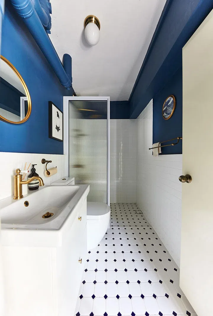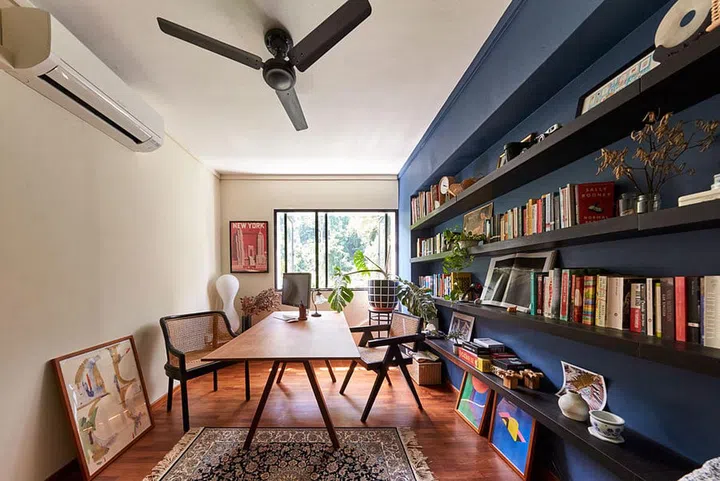 They reserved one bedroom as a guest room and converted another into a study. Both bookworms, their favourite tomes sit on shelves built along the length of the navy-blue wall in their study, while mismatched chairs flank a handsome wooden desk they got second-hand.